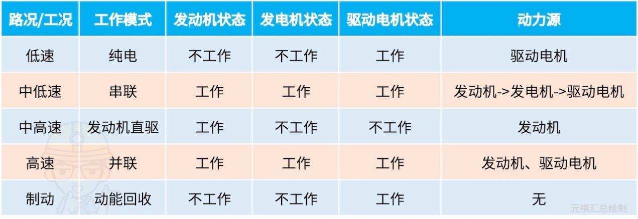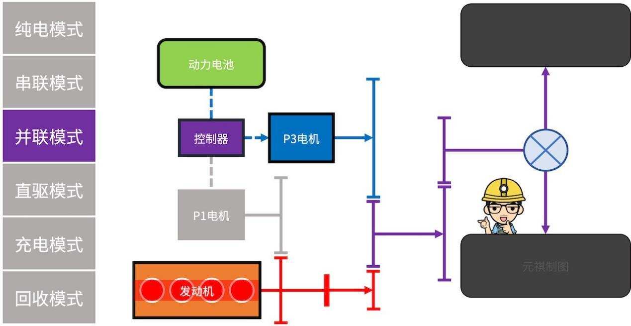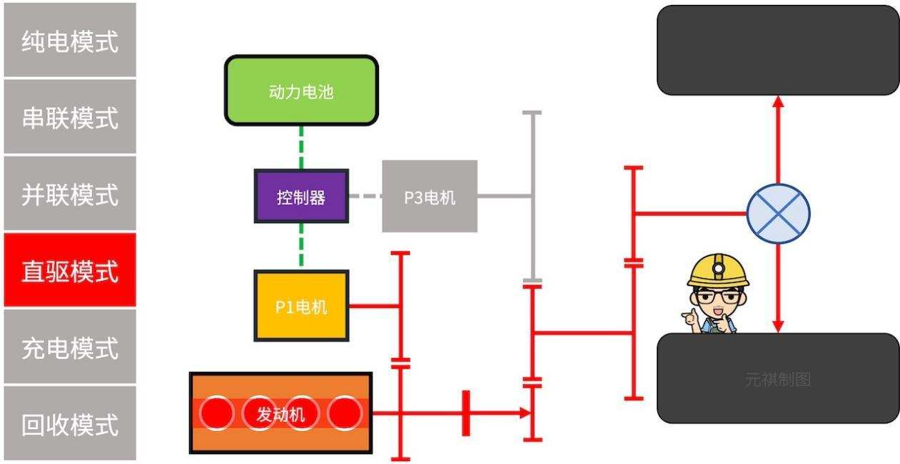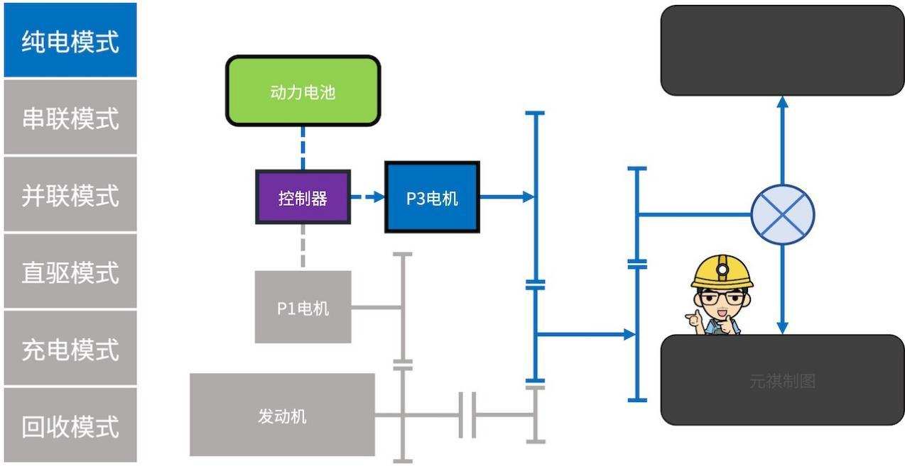纯电模式:在低速工况下如市区拥挤路段,此时「发动机」处于低效率区间,所以不工作,而是由「驱动电机」直接驱动车轮;