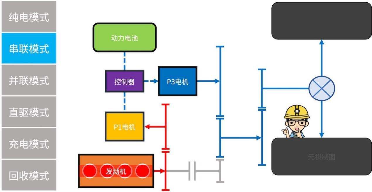 串联模式:在低速工况下电池电量不足时,由「发动机」带动「发电机」为「驱动电机」提供动力,同时「电机控制器」控制功率流动,保证「发动机」处于高效工作区间;
