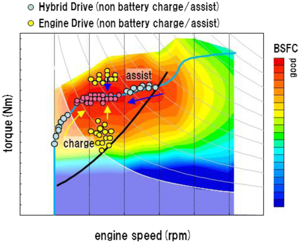 简而言之:混动模式是通过「电机补充动力」(assist)或者「存储多余能量」(charge),让「发动机」始终工作在经济区域,即油耗最低区域。