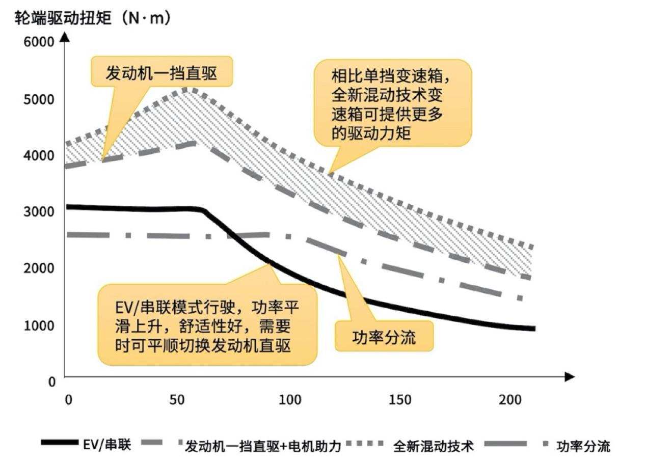 加入两挡变速机构给整套混动系统带来了巨大的变化,比如: