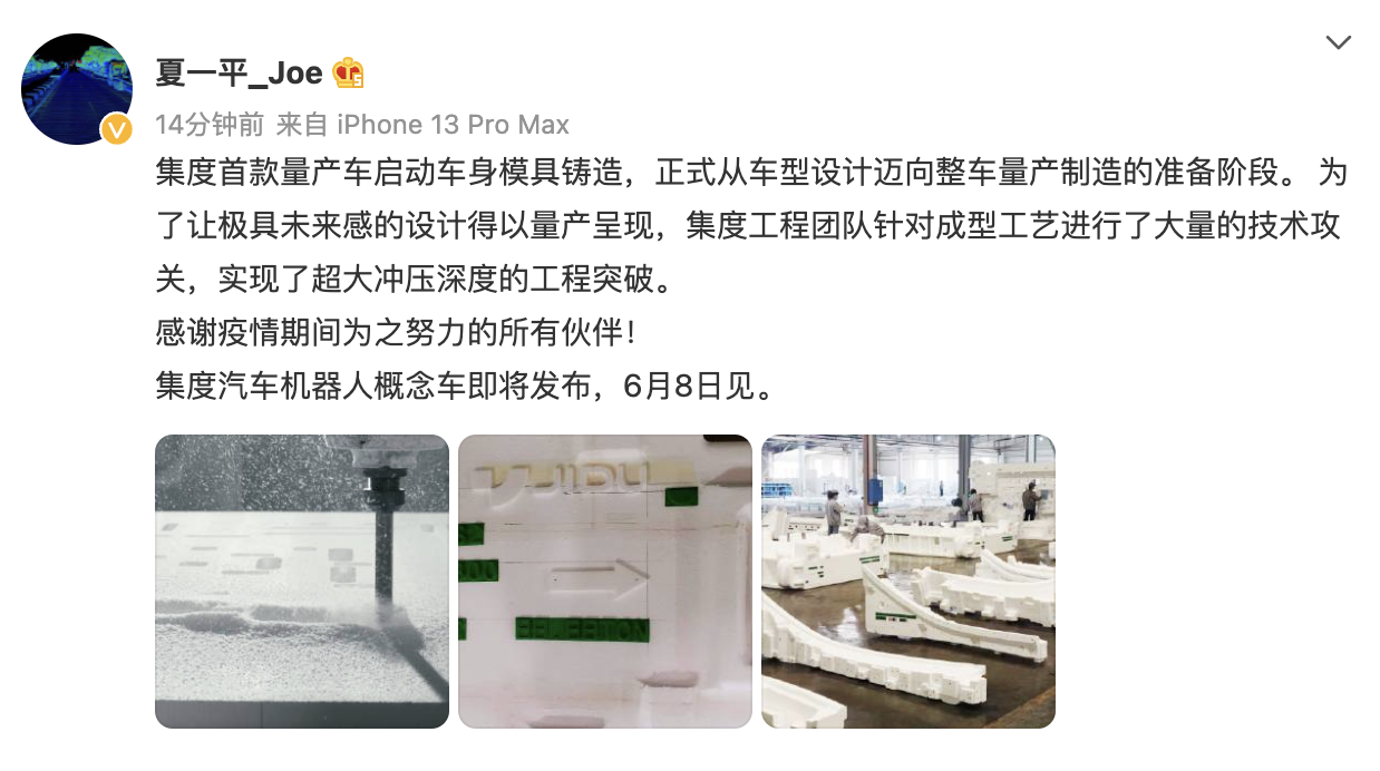 5月25日,集度CEO夏一平在其社交平台上宣布了集度汽车最新造车进展。据悉,集度首款量产车已经启动车身模具铸造,正式从此前的车型设计迈向了整车量产制造的准备阶段。