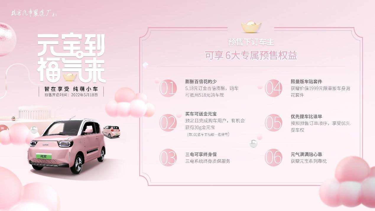 5月18日,北京汽车制造厂(以下简称北汽制造)宣布旗下全新纯电车型“元宝”正式开启了预售,预售价区间为3.49万至4.99万元。与此同时,北汽制造还宣布了该款车型的订购权益,只需支付5.18元,即可享受订金百倍膨胀,以及三电终身质保、优先提车、限量版车贴等福利。