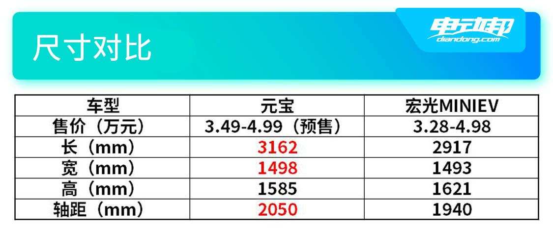 当然,对于A00级小车来说,空间表现也是决定舒适度的重要指标,在这方面北汽制造的“元宝”长宽高分别为3162/1498/1585mm,轴距为2050mm。而五菱宏光MINIEV不仅要比“元宝”更短和略窄,在轴距上更是少了110mm,相信实际体验的差距会更加明显。