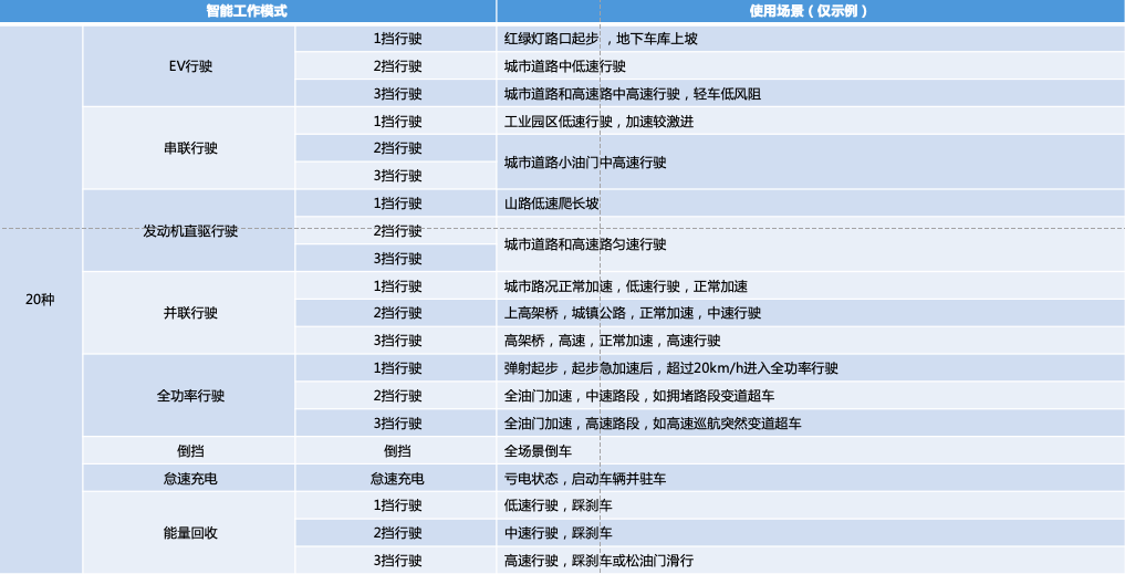搭载「领克智能电混」两驱车型的20种智能工作模式