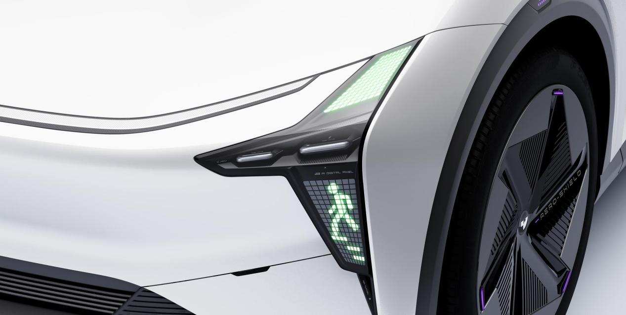 ROBO-01前脸是贯穿式灯带,LOGO在通电后也会点亮。大灯下方的屏幕上还能进行灯语交互。比如行人横穿马路时,上面会显示行人动效,充电时也会显示电量动效,后续大概率还支持DIY创作。虽然在灯组大玩人车交互也不是集度首创了,但仍然可以窥见其对未来出行的概念畅想——让车成为一个更拟人化的交通参与者。