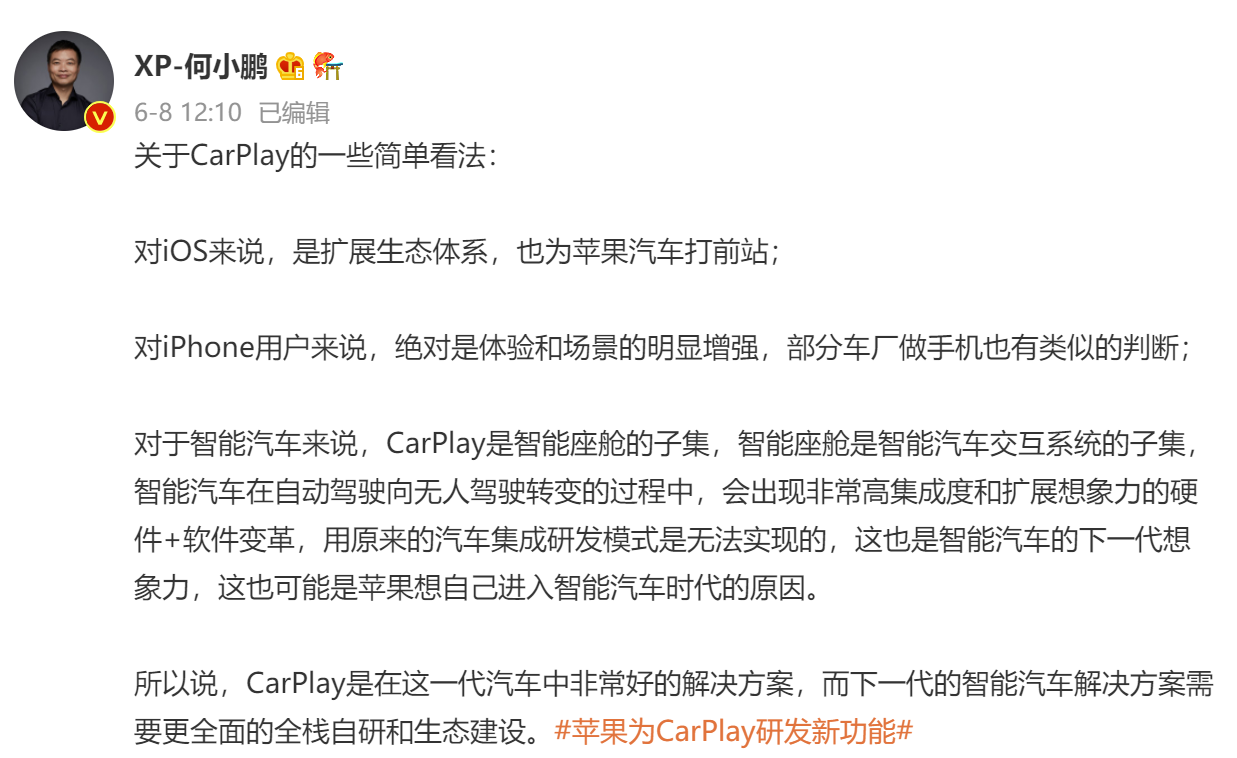 『CarPlay是在这一代汽车中非常好的解决方案,而下一代的智能汽车解决方案需要更全面的全栈自研和生态建设。』