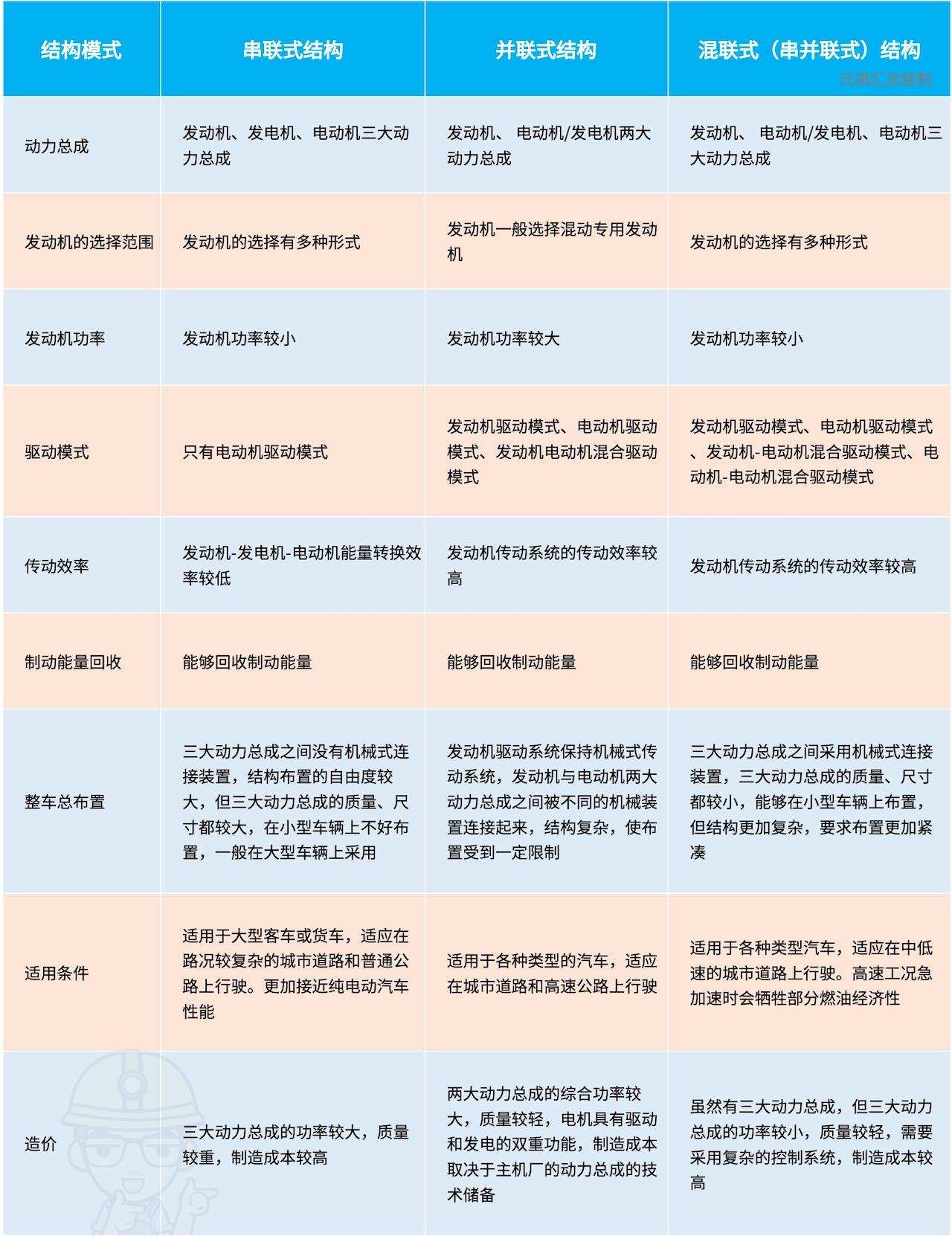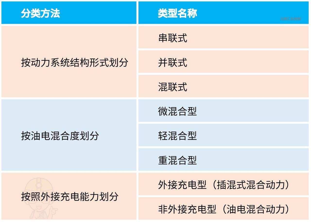 在以上三种分类中,第三种分类『按照外接充电能力划分』比较好理解,一句话:能不能外接电源来充电。而『按动力系统结构形式划分』则需要通过另一张表来解释(详见《混动百科》汇总篇3):