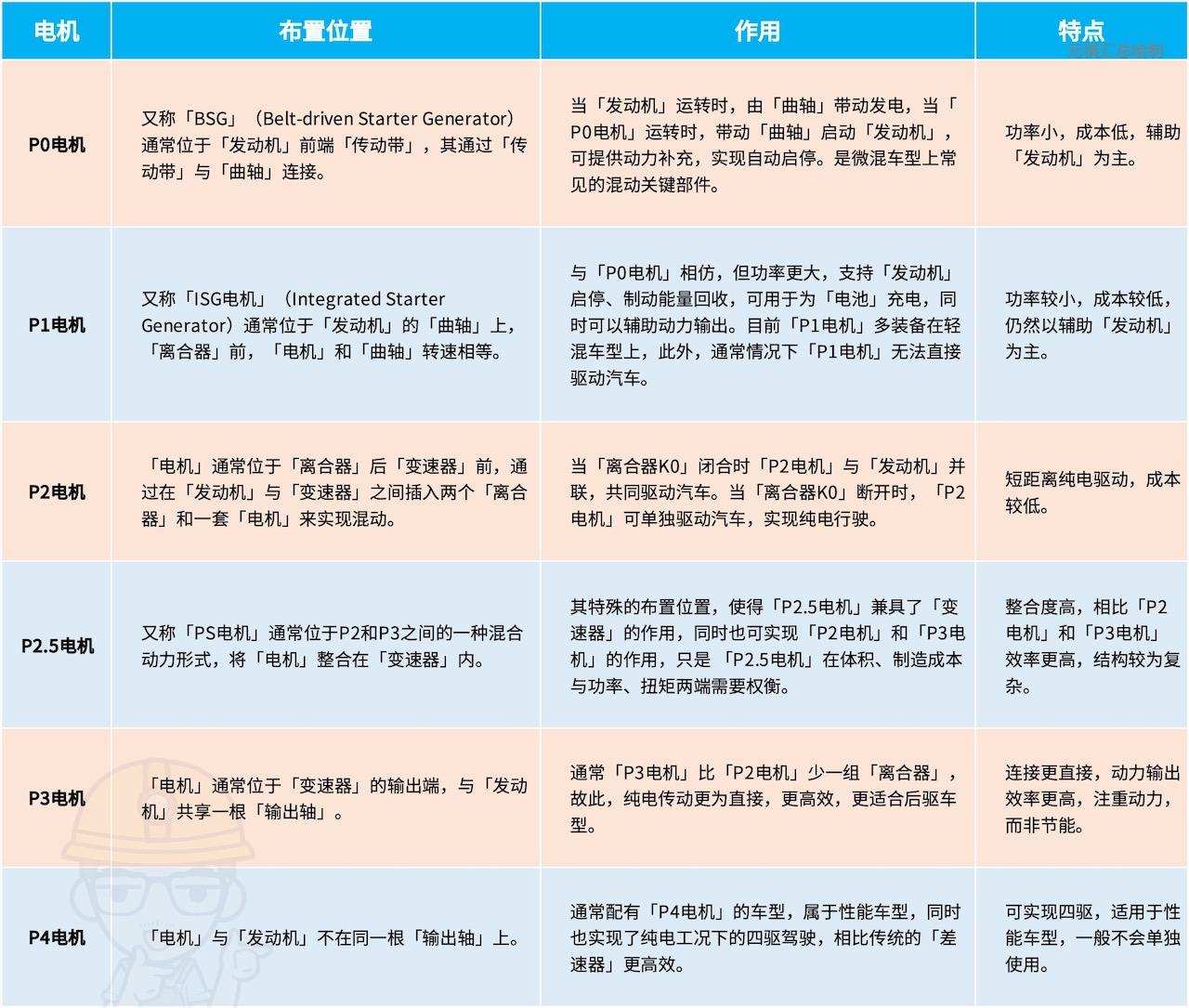 当然,无论是「串联式」、「并联式」还是「混联式」都会有「电机」,所以,为了方便大家研究混动技术,必须给每个「电机」一个『昵称』,通常我们通过「电机」所在位置的不同给这些「电机」命名,比如『位置1号电机』,也就是『Position 1电机』,简称「P1电机」(如下图)。