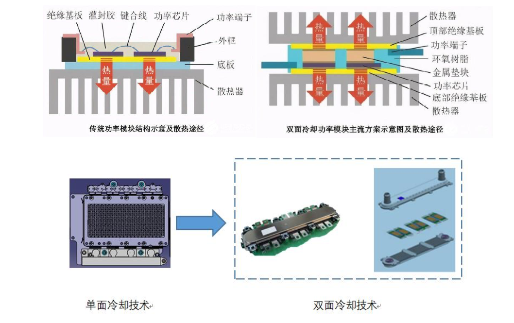 传统的「功率模块」采用单面冷却结构,将底板固定在冷却器表面,「功率芯片」损耗产生的热量通过绝缘基板、底板单方向传导至散热器。和单面结构散热结构相比,双面冷却结构在「功率芯片」的两侧均焊接有绝缘导热基板,「功率端子」全部与绝缘导热基板相连,绝缘导热基板的外侧安装有散热器。故此,散热的效率更高,提高了电机系统的性能,延长了整套系统的寿命。