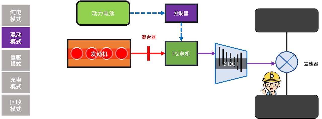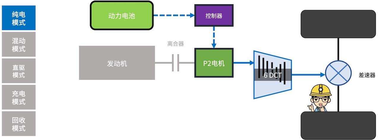 纯电模式:「发动机」不参与工作,「电池」带动「P2电机」,纯电驱动,适用于城市路况;