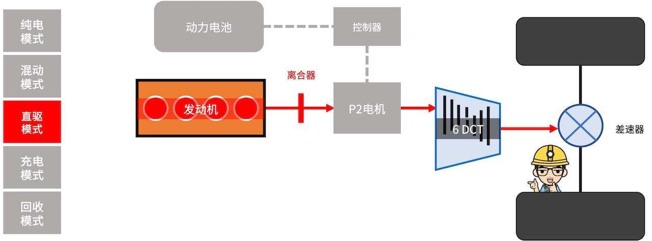 发动机直驱模式:控制「发动机」介入的「离合器」(K0)耦合,此时可以将整车看做一辆传统的燃油汽车。