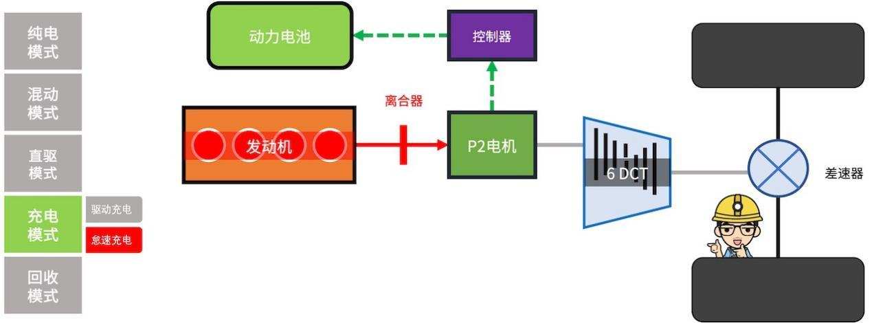 2)怠速充电:车辆停止时,「发动机」继续运转,带动「P2电机」,从而为「电池」充电。