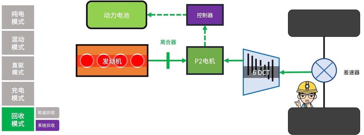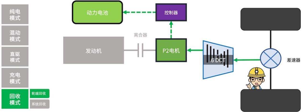 1)轮端回收:即是直接将制动时,轮端的动能通过「P2电机」进行回收;