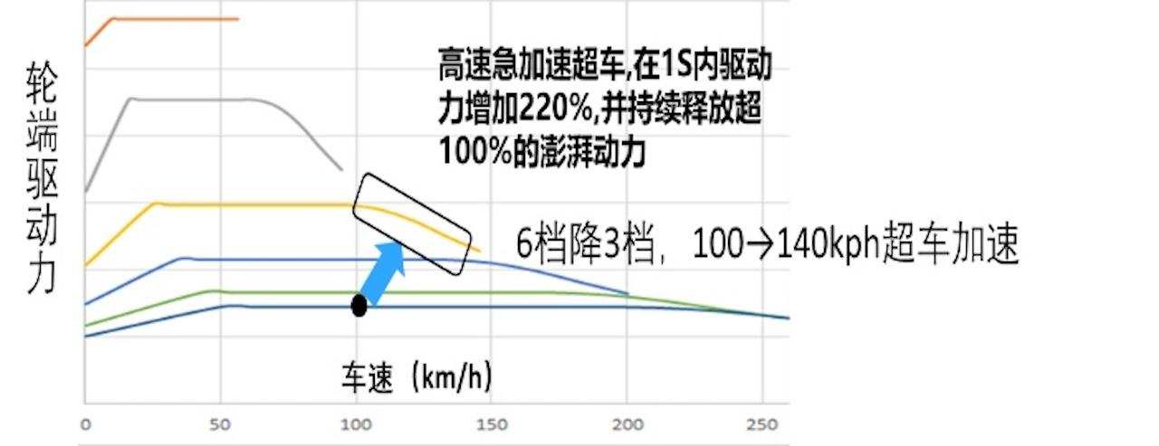 2. 高速工况下,利用6档「电驱变速器」的优势,与传统燃油车一样实现快速实现动力降档,达到动力的二次爆发,满足高速场景下的急加速需求;