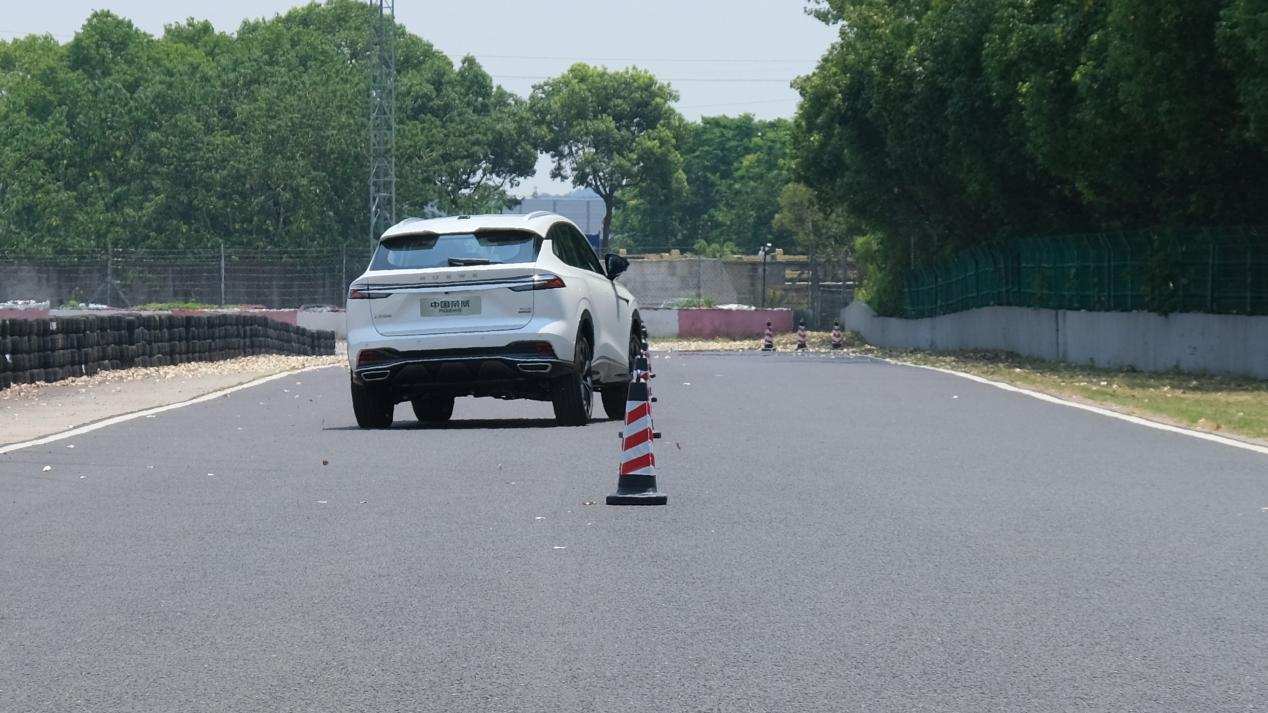 不过,在好奇心的驱使下,我们想试试70km/h时速下的表现。在征得了教练的同意后,我们对这台车开启了『加练』。几趟来回之后,我们发现在接近70km/h的临界点时,车尾会开始出现不安分的迹象,但此时车身依旧在车身电子稳定系统的工作下处于可控状态,轮胎也没有出现搓胎弹跳的现象。至此,我们也算隐隐触摸到了这代RX5在绕桩表现上的极限,希望能给到大家一些参考。