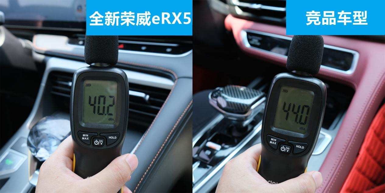 最后的一项动态测试其实更关乎舒适性,那就是在追求性能时,发动机高转速情况下的NVH噪音表现。为此,厂家还安排了一台同级别的竞品选手作为对比。上图是两台车在怠速工况下的车内前排的NVH表现,左边是第三代荣威eRX5,最低分贝值为40.2dB,右边为竞品车型,最低分贝值为44.0dB。不过以我们多年的经验来看,大多数用户对于45dB以下的噪音是不敏感的,但是会有少数用户十分在意,所以低一点的怠速分贝总是加分的。