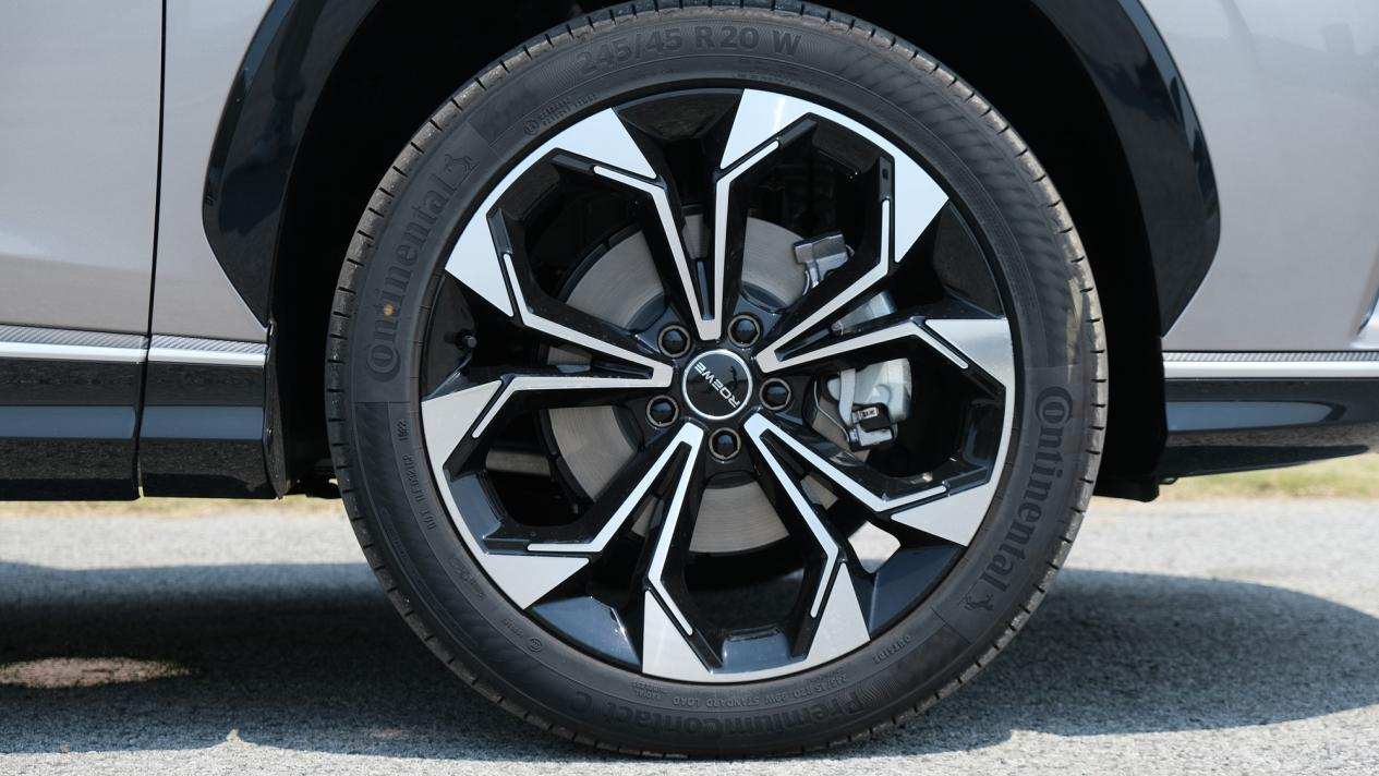 这台荣威eRX5装备了20寸的钻石花瓣型轮毂,与之匹配的是规格为245/45 R20的马牌PCC轮胎,这款轮胎主打干湿地的抓地性能,所以在前面的动态测试中,这台车能测出比较理想的成绩,除了适宜的气温之外,这组轮胎也出了不少力。