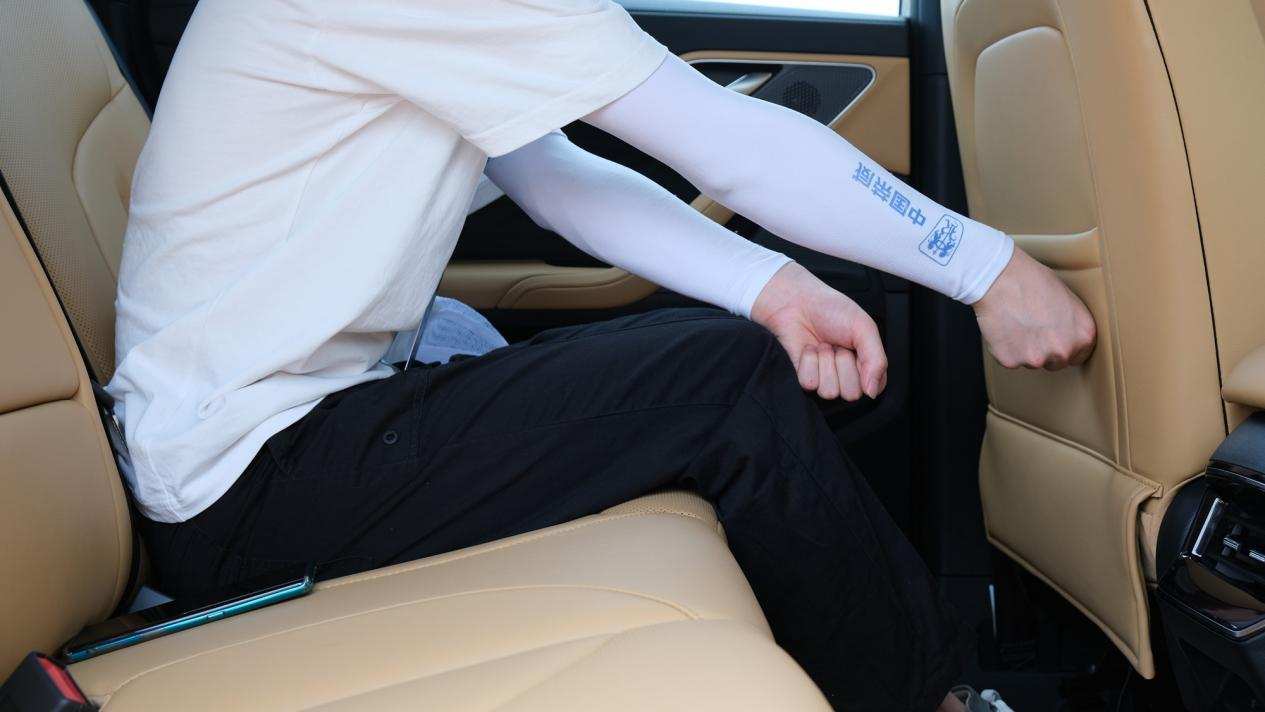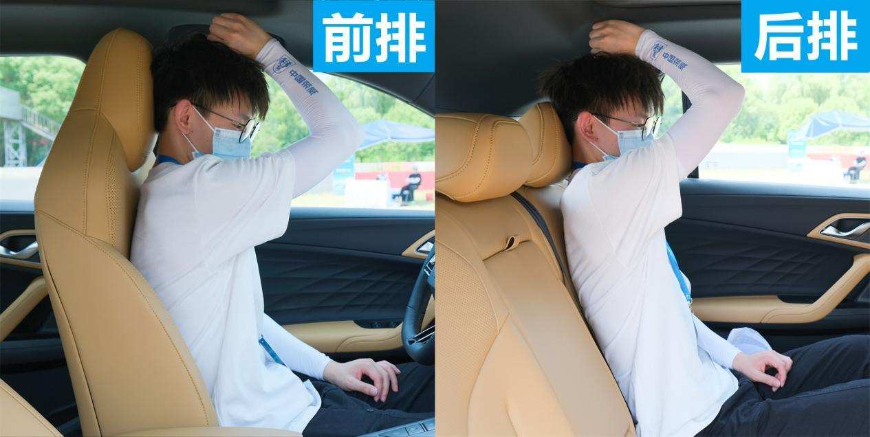 乘坐空间方面,我们以身高170cm的模特为例。可以看到,在调到其合适的位置后(前排座椅调到了最高位置),此时前排与后排的头部空间均一拳有余,加上全景天幕内凹的部分,实际头部空间会更富余一些。