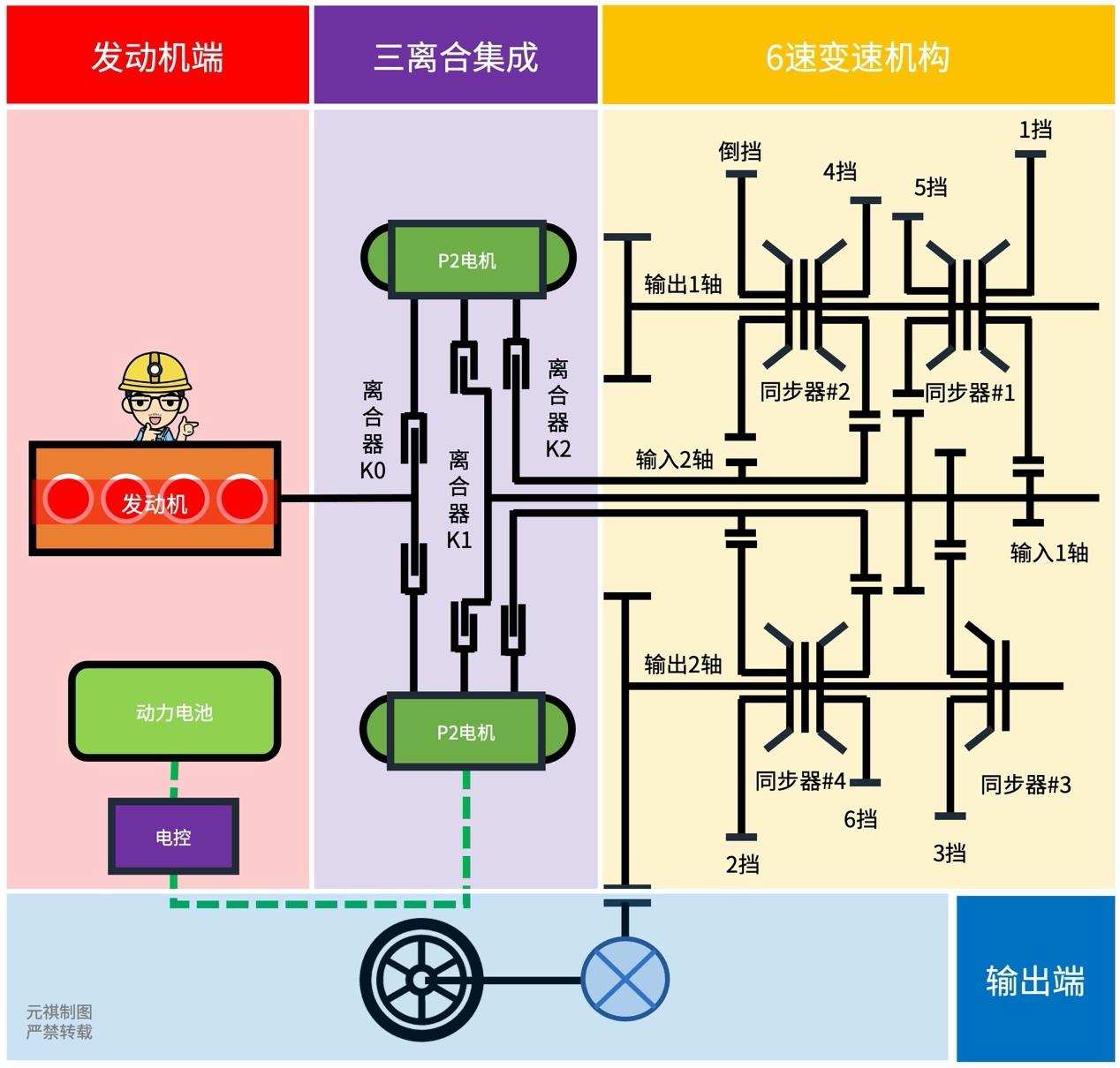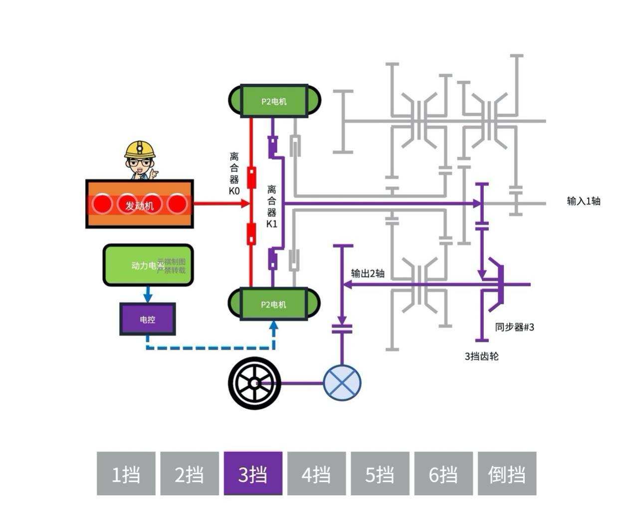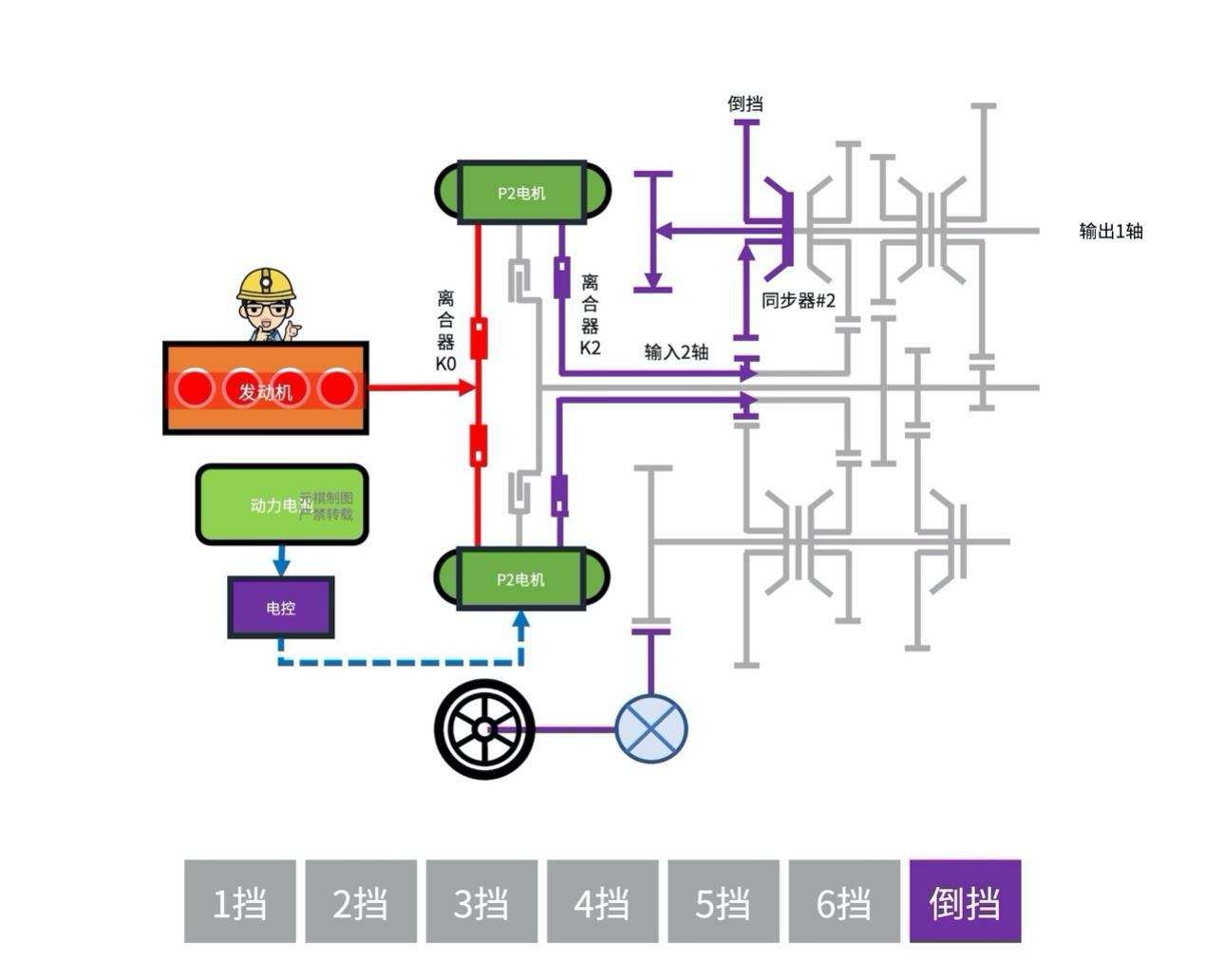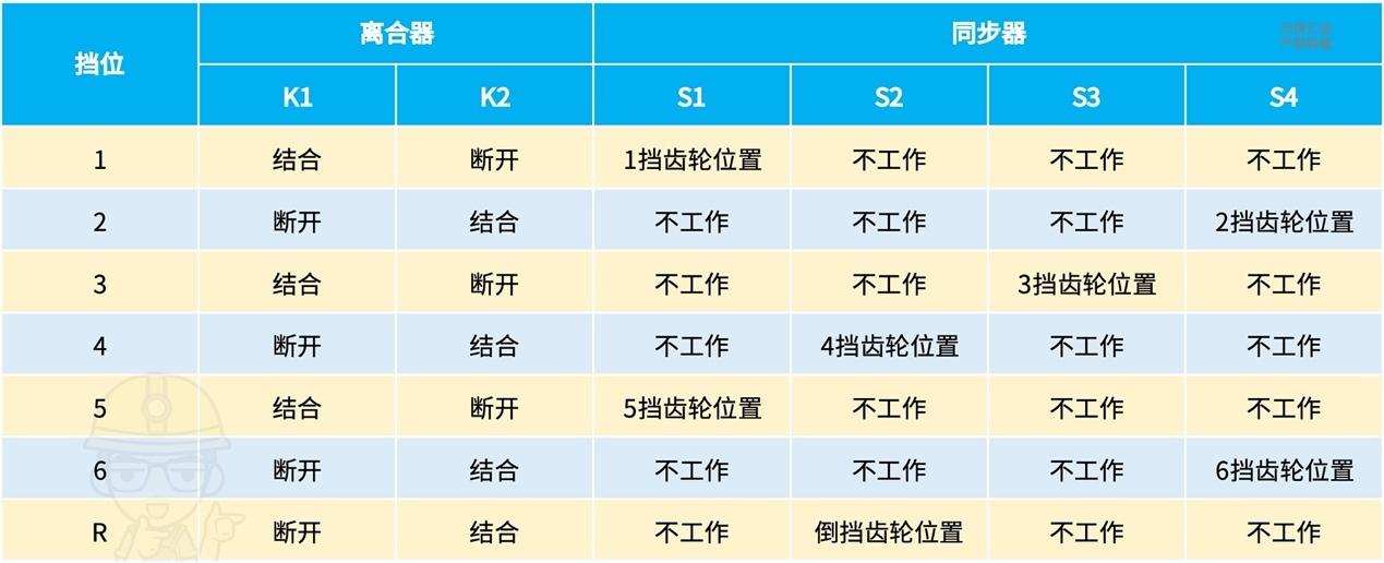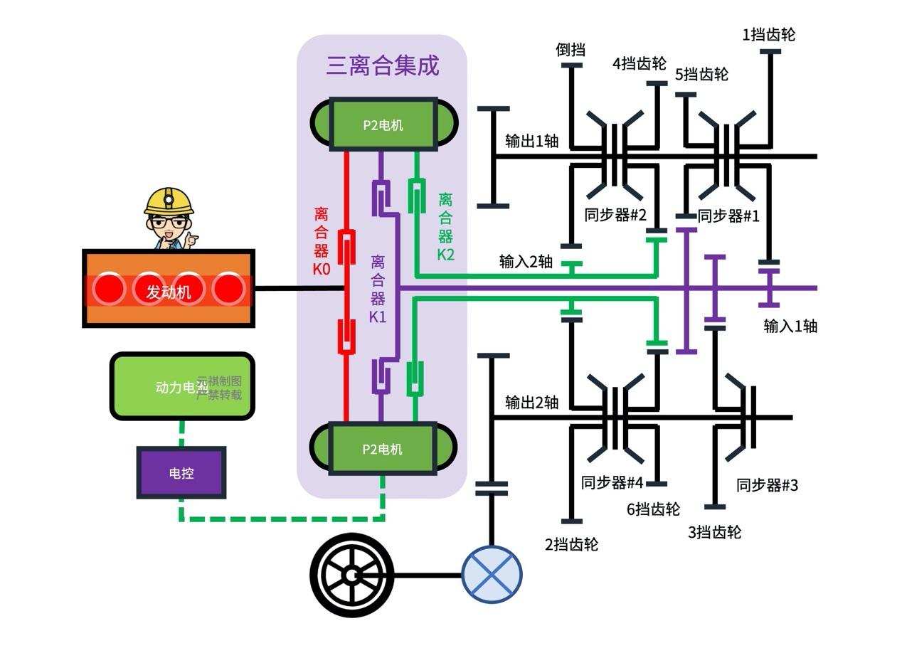 ·「离合器」(K1)控制切入「输入1轴」(即1、3、5挡齿轮所在的轴)。「离合器」(K2)控制切入「输入2轴」(即2、3、6和R挡齿轮所在的轴);