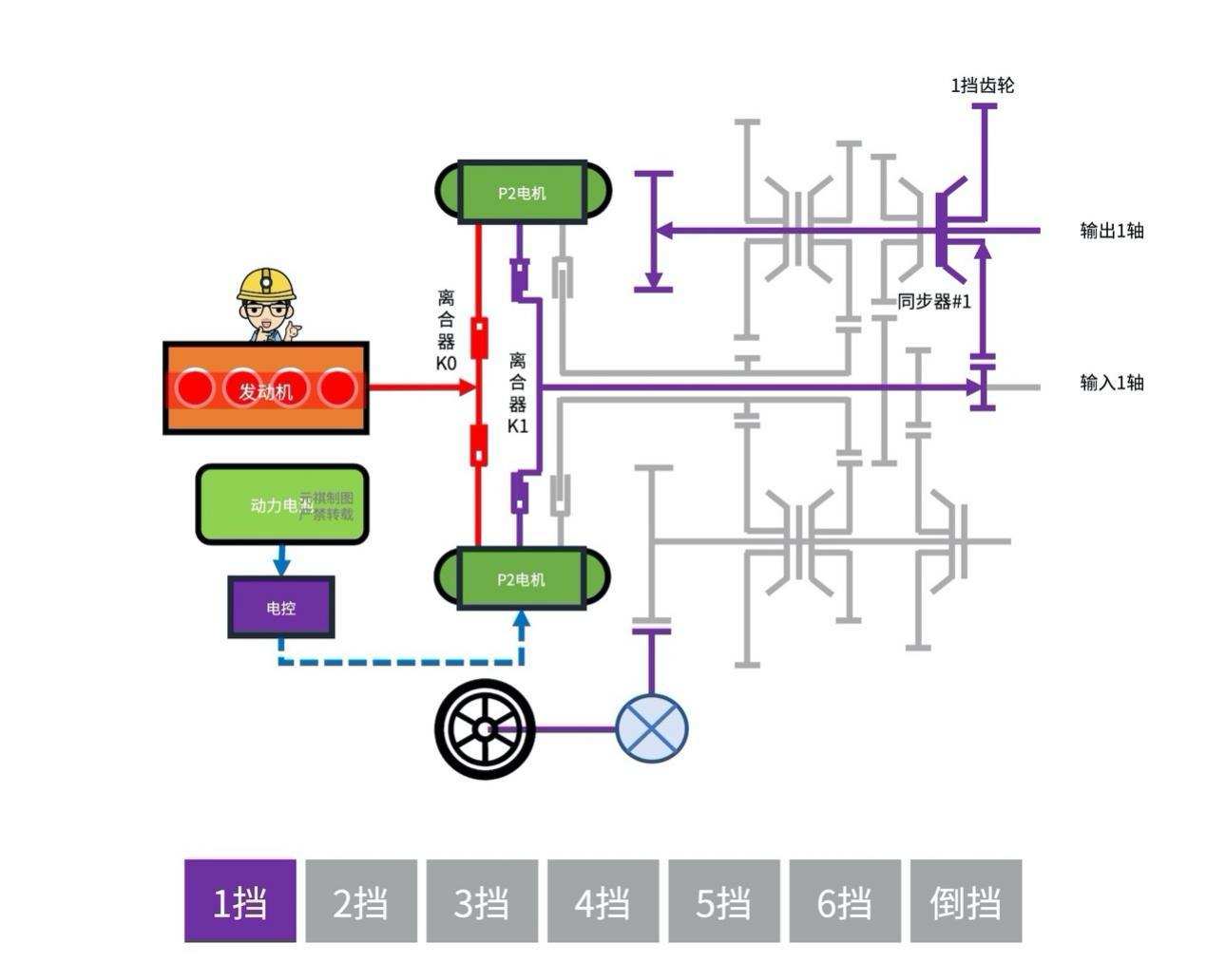 混动模式1挡:「发动机」的功率通过「离合器」(K0)与「P2电机」的功率共同进入「变速机构」,当「离合器」(K1)闭合时,功率流则从「输入1轴」流向「变速齿轮」,比如当「同步器」(S1)切换至「1挡齿轮」时,功率流进从「输出1轴」流出,最终通过「减速齿轮」和「差速器」等机构到达「车轮」。