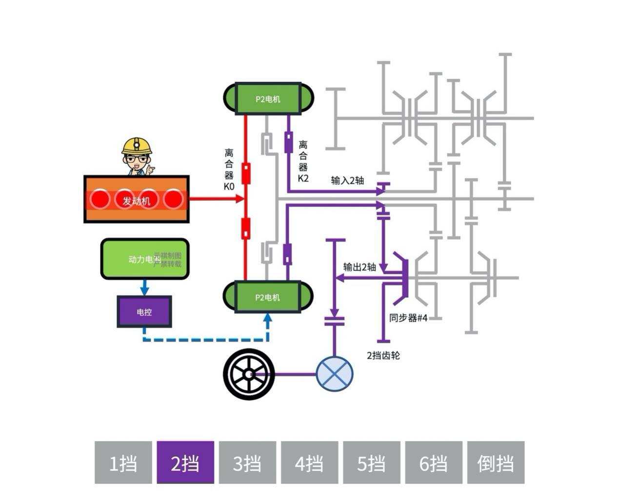 其连接特点在于通过「离合器」(K0)将「发动机」与「P2电机」的转扭耦合,故此,两者汇总的功率都可以在6速「变速机构」中得到调节。