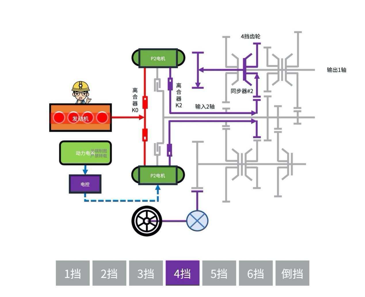 混动模式4挡:「离合器」(K2)闭合时,功率流则从「输入2轴」流向「变速齿轮」,比如当「同步器」(S2)切换至「4挡齿轮」时,功率流进从「输出1轴」流出;