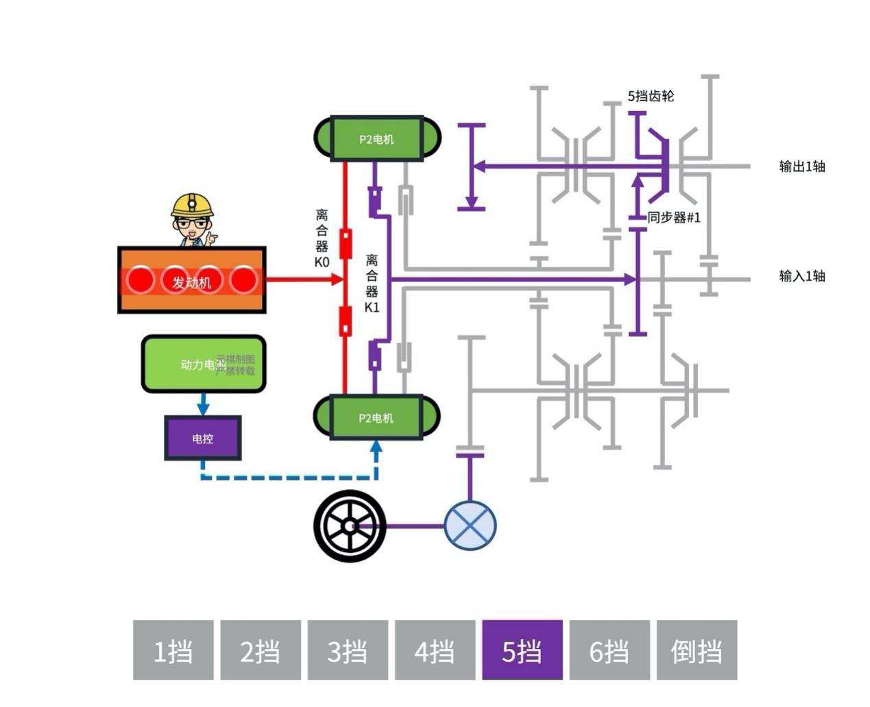 混动模式5挡:「离合器」(K1)闭合时,功率流则从「输入1轴」流向「变速齿轮」,比如当「同步器」(S1)切换至「5挡齿轮」时,功率流进从「输出1轴」流出;