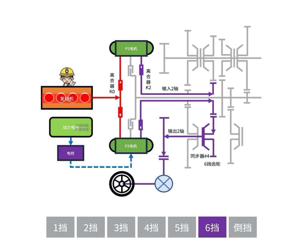 混动模式6挡:「离合器」(K2)闭合时,功率流则从「输入2轴」流向「变速齿轮」,比如当「同步器」(S4)切换至「6挡齿轮」时,功率流进从「输出2轴」流出;