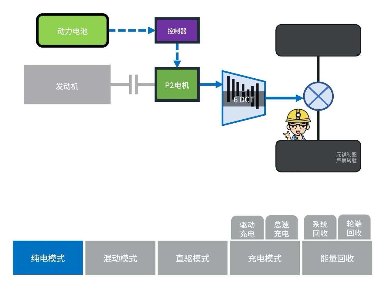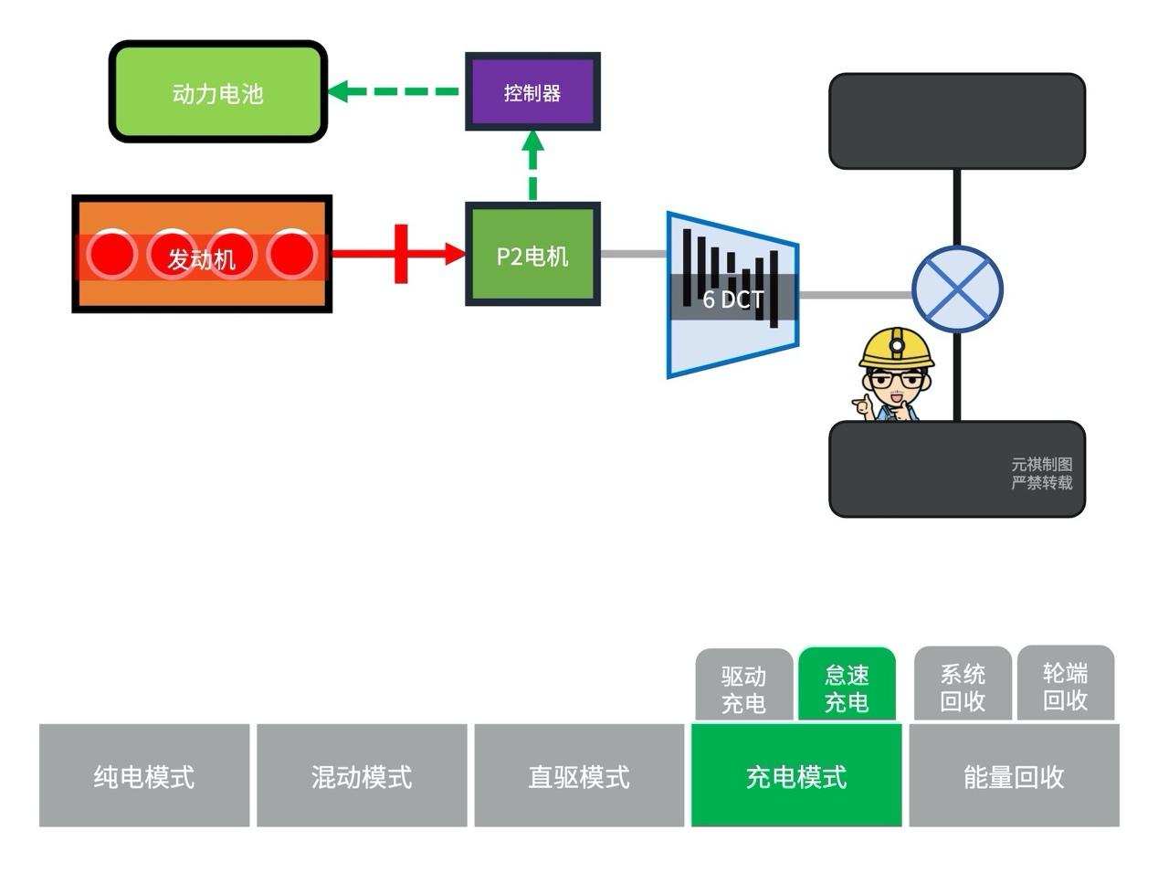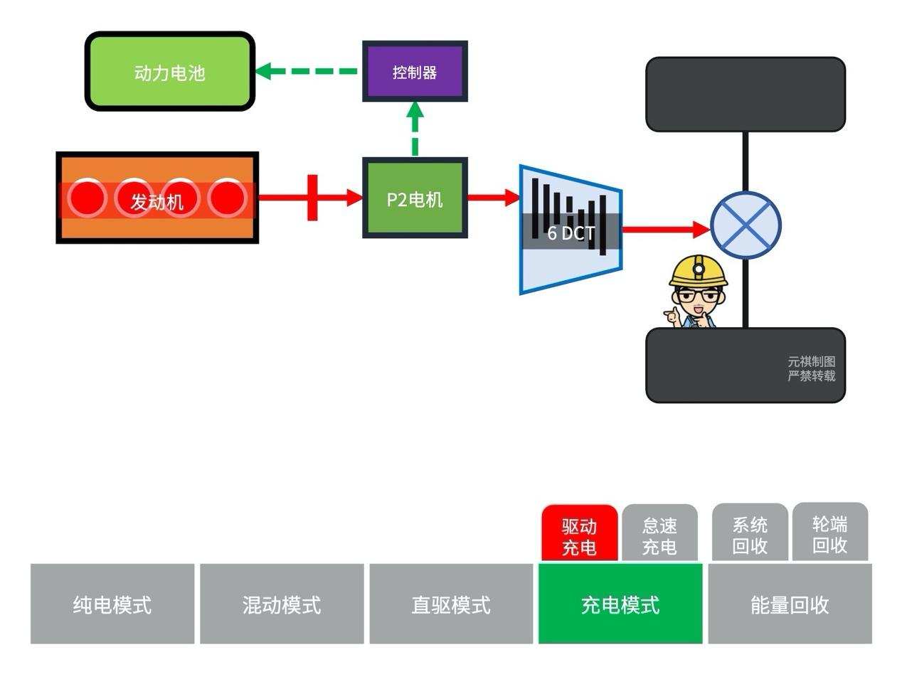 我们以混动模式(并联)下的功率流走向来分析: