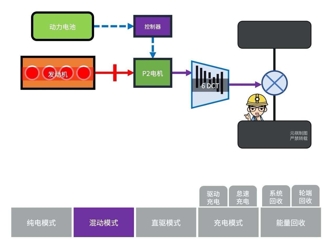 当我遇到前车速度较慢,想要超车时,我会深点加速踏板,系统判定我对轮端的转扭需求超出了「P2电机」所能供给动力的合理范围,「发动机」启动,「离合器」(K0)闭合,从而进入混动模式。「发动机」与「P2电机」共同发力驱动汽车。