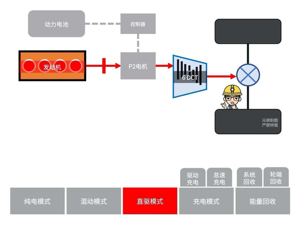 以2挡为例,上图(动图)展示不同工作模式下「电驱变速器」的具体工作原理,大家可以配合上面的表格对应理解。
