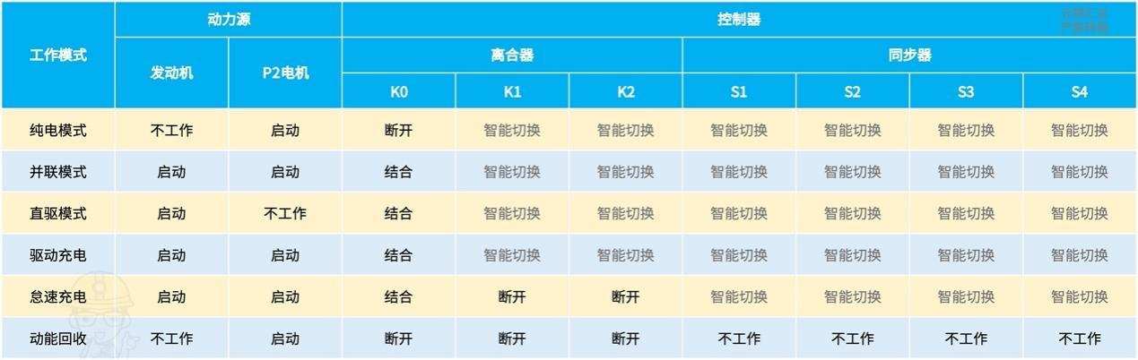 汇总了一张工作模式和组件的对应表,帮助大家更精确地理解「蓝鲸iDD」的「电驱变速器」工作原理。