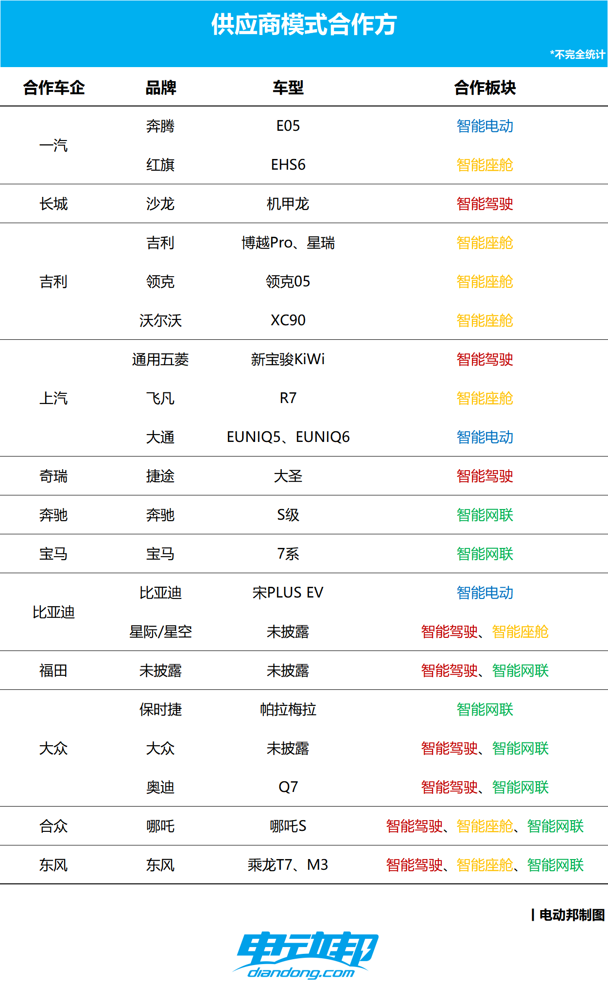 从合作方的数量上我们可以看到,供应商模式虽然可能不是最为大众熟知的,但却是目前华为与大多数车企『拜码头』的方式。在供应商模式下,华为主要提供软硬件服务,涵盖智能驾驶、智能座舱、智能电动、智能网联和智能车云五个板块,基本打造出了『传感器-芯片-操作系统-算法与开发应用-云服务』的生态布局。