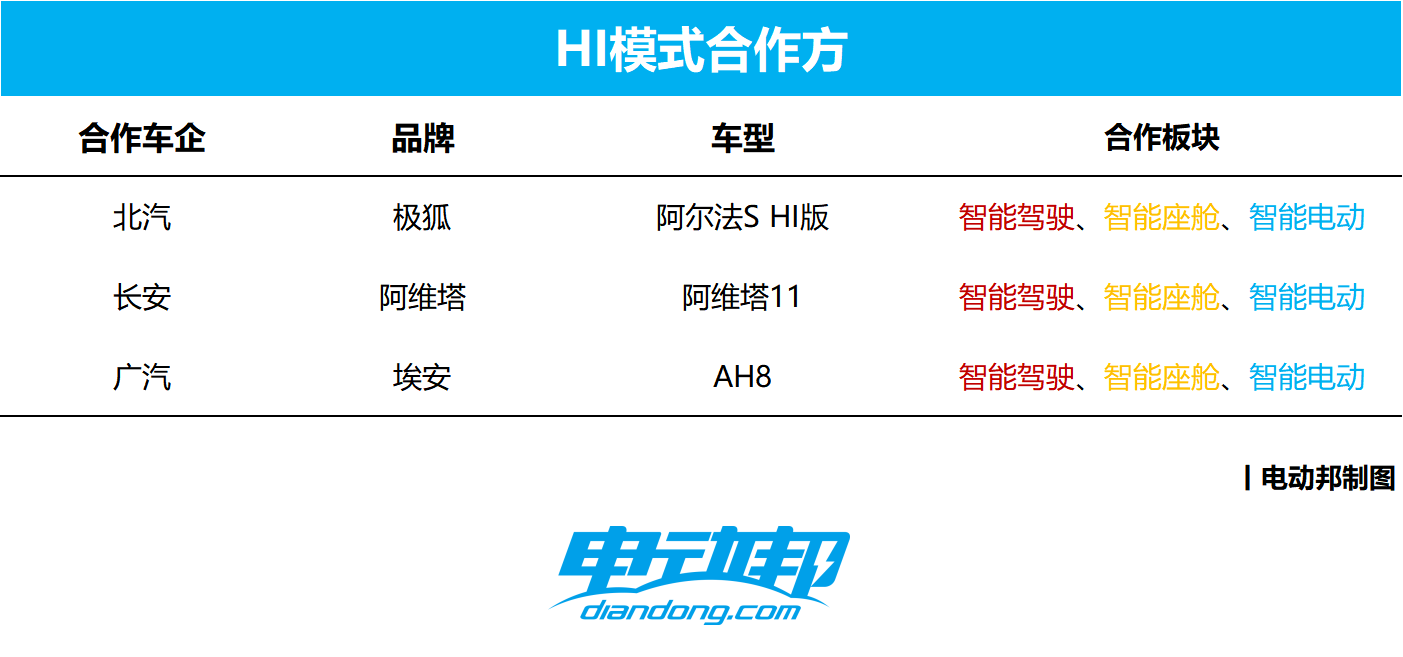 第二种则是Huawei Inside模式(下文简称HI模式):整合华为与车企的资源,双方共同定义、联合开发,并使用华为的全栈智能汽车解决方案。