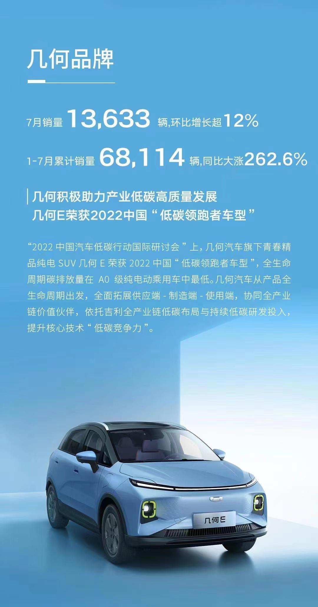 说到这里,就不得不提到吉利汽车集团旗下中高端纯电品牌几何汽车。作为面向大众主流用户的纯电品牌,几何汽车销量屡创新高:今年7月几何汽车销量达到13633辆,月销持续破万。今年1-7月,几何汽车累计销量达到68114辆,同比劲增262.6%,位列纯电市场第6,排名环比上升5位。