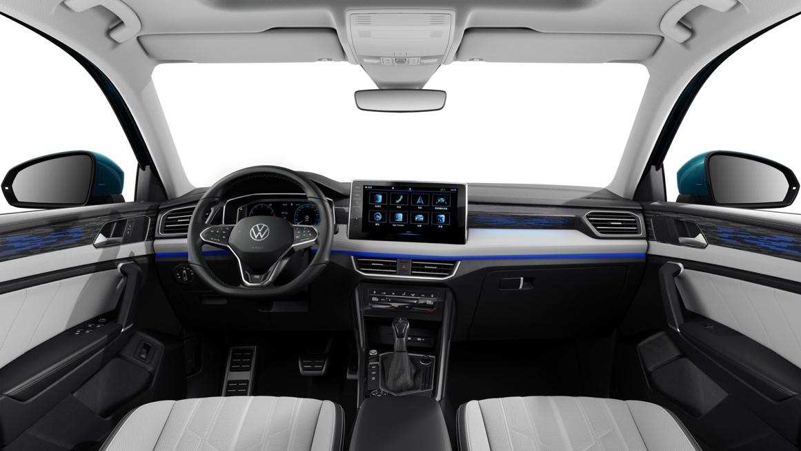内饰部分,全新探岳家族在前排中控台区域采用了层次分明的设计布局,我很喜欢这个黑白主色调搭配蓝色饰条的组合,整体看起来非常清爽,尤其对于GTE版本来说,“白云蓝天”特别应景。