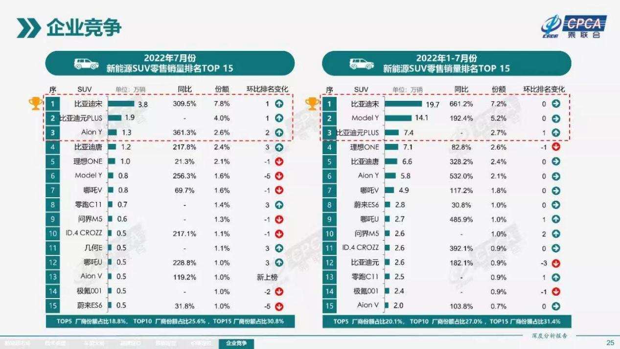 首先,几何E所在的小型纯电SUV原本就是一个仍然有很大潜力的细分市场。从下图我们可以看到,在新能源SUV销量排名前15位的车型中,小型SUV只有哪吒V与几何E两位,它们的销量分别在8千和5千台的水平。