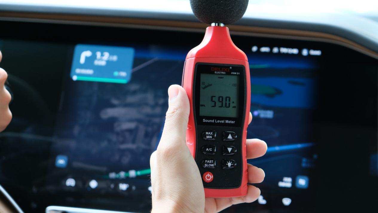 这台车四门都采用了双层隔音玻璃,实际道路试驾体验中,也能感受到其良好的隔音静谧性,根据实测,在60km/h的时速,小声交谈的环境下,车内取得的最低分贝值为59.0dB。