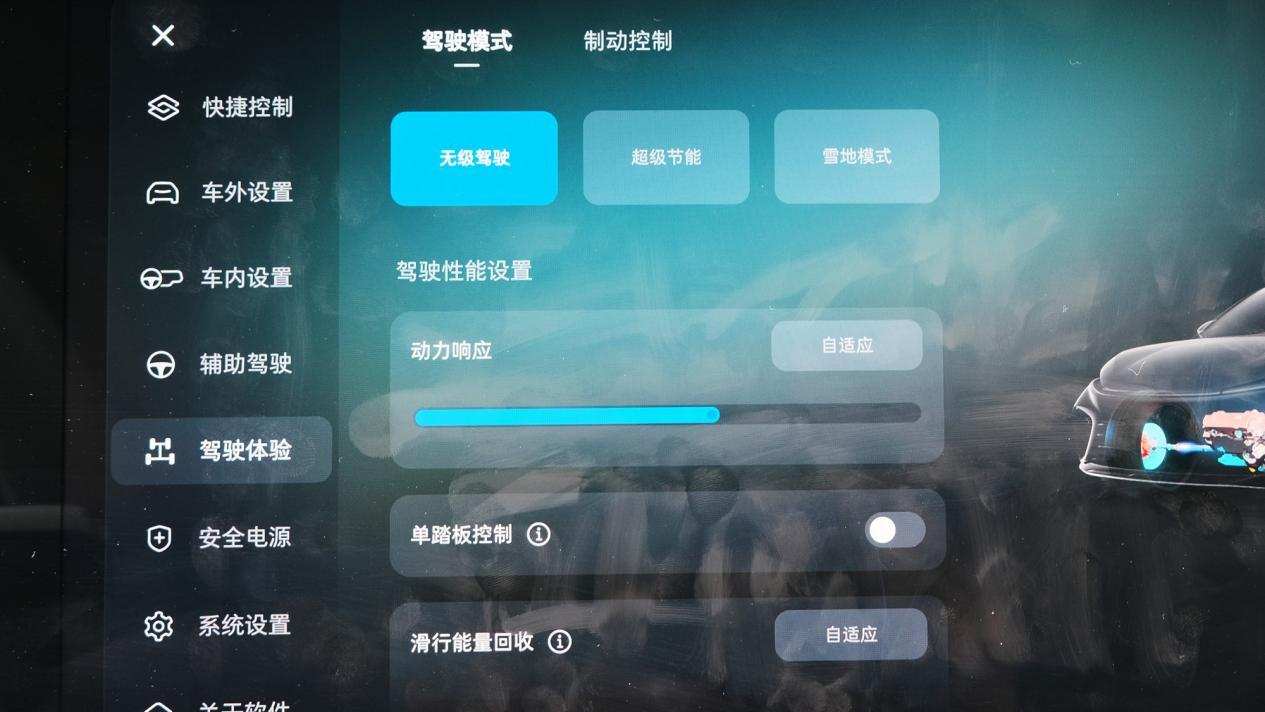 值得一提的是,这台车除了「超级节能模式」以及「雪地模式」,还有一项罕见的「无极模式」,在此模式下,这台车的动力释放、刹车脚感、动能回收都可以「无极调节」,你甚至可以把动能回收的强度彻底关掉,以获空档滑行的体验。这是一项高度自定义、去标定化的突破,可见飞凡R7是想让每位用户都能调整出一套最适合自己的驾驶风格,打造专属于自己的驾驶体验。