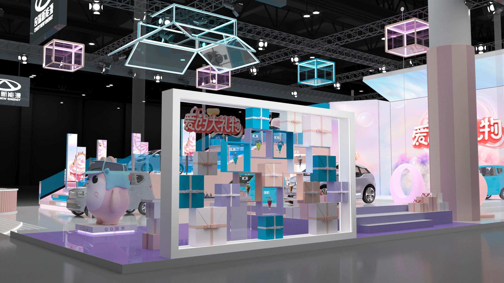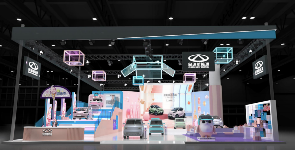 来到11号馆H1106奇瑞新能源展台,我们一下就被这粉粉嫩嫩Q萌Q萌的风格吸引到了。不得不说,这展台设计可是用心了。