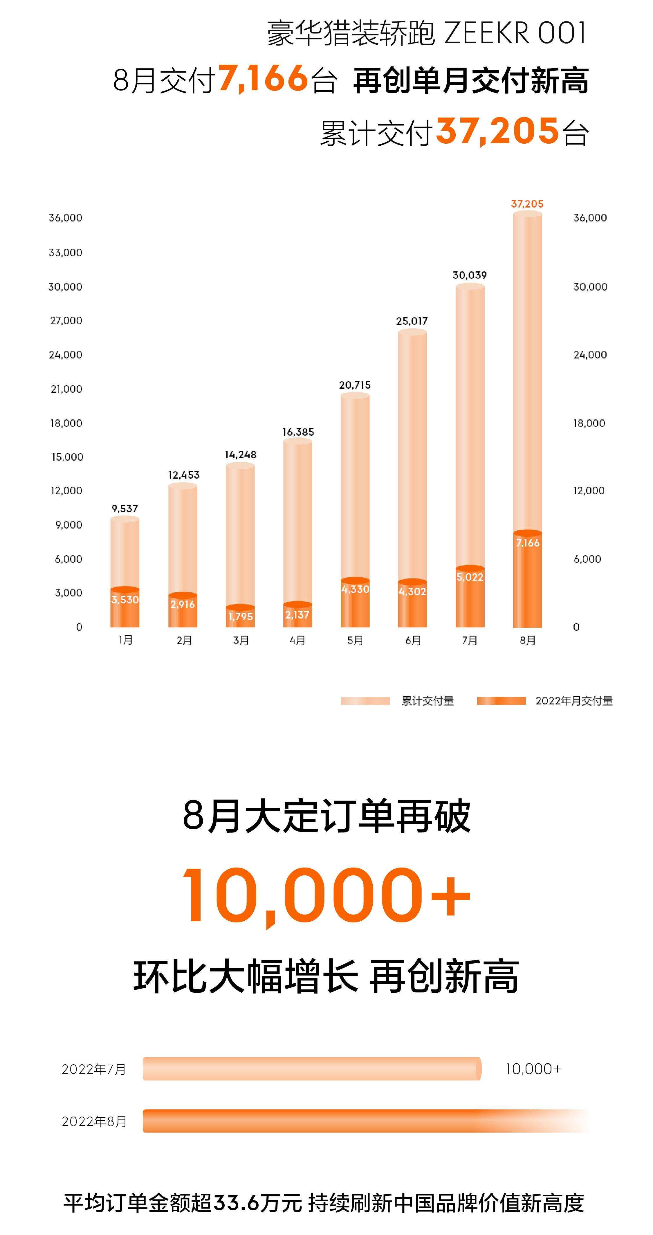 9月1日,极氪汽车正式公布了8月份的销量数据,旗下首款车型ZEEKR 001实现交付7166台,再创单月交付历史新高,累计交付达到了37205台。同时,8月份的大定订单数量也突破了1万辆,预计ZEEKR 001将来的销量可能会迎来新的增长。