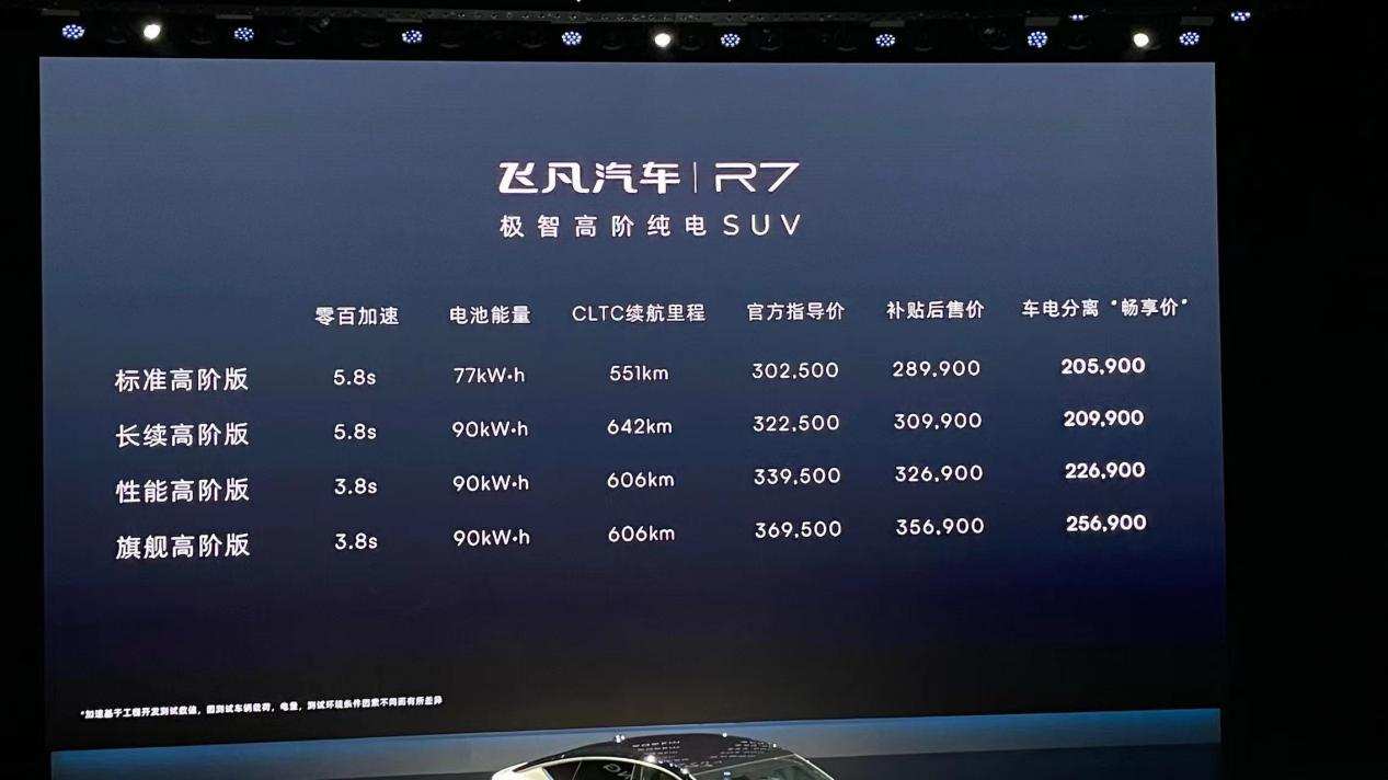 9月27日,「极智高阶纯电SUV」飞凡R7正式上市,共推出4款车型,官方零售价30.25万元起。在此价格基础上,年内交付的飞凡R7全系车型,将享1.26万元的新能源国家补贴,补贴后价格为28.99万元起。