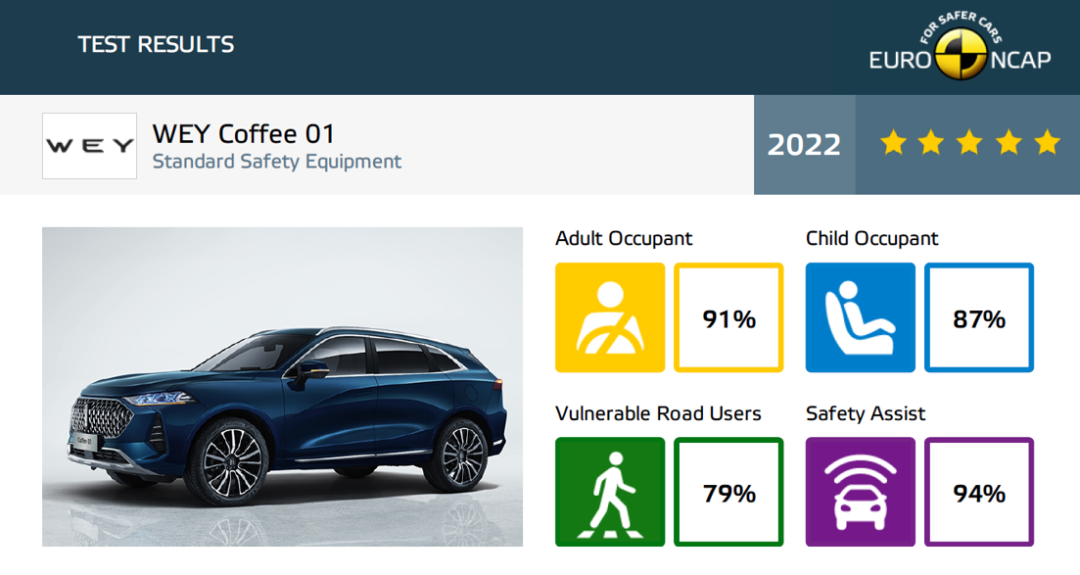 值得一提的是,摩卡PHEV(Coffee 01)不仅完成了WVTA欧盟整车型式认证,符合严苛的欧6d排放标准,在安全性上也达到了E-NCAP五星安全标准。新车在E-NCAP中成人乘员、儿童乘员、弱势道路使用者、安全辅助四个单项得分率分别为91%、87%、79%、94%,获得五星安全评级,成为 E-NCAP 主动安全得分最高的自主车型。