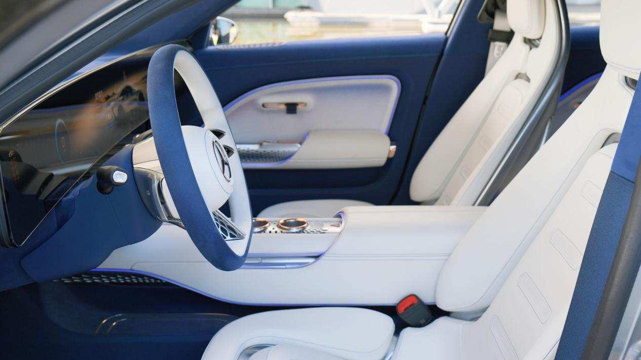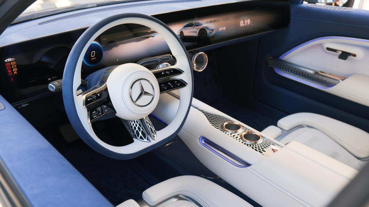 内饰方面,这款概念车配备有巨大尺寸的贯穿式一体的中控屏,这也是奔驰打造的第一款完全无缝且在两个A柱间跨度达到47.5英寸的屏幕。