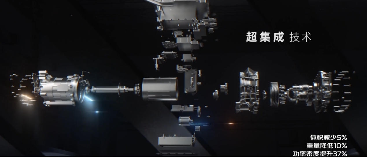 电驱总成集成技术:集成电机、电机控制器、减速器、充电机、DCDC、DCAC、高压分线盒。较“三合一”重量降低10%、体积降低5%、效率提升4.9%、功率密度提升37%;