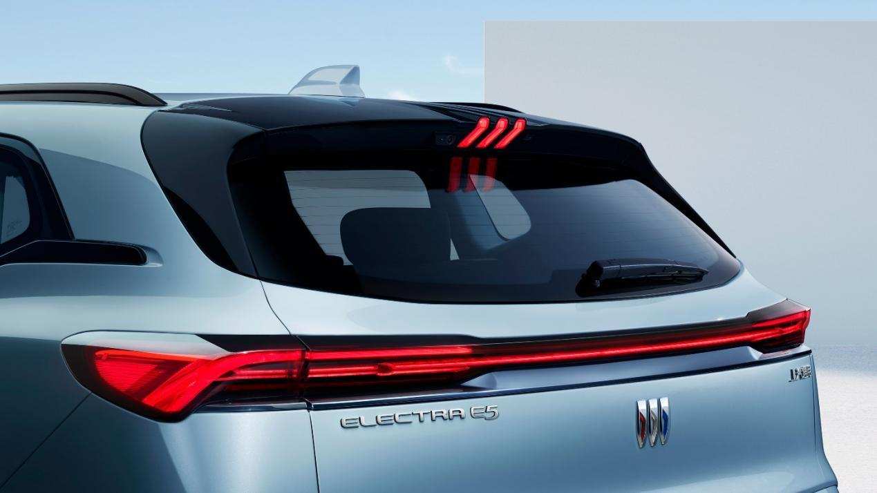 别克Electra E5的尾部造型同样充满科技感,贯穿式流光飞翼尾灯,拓展了车尾视觉宽度,高位刹车灯与全新别克徽标相呼应,流水转向灯进一步强化整车运动气息。