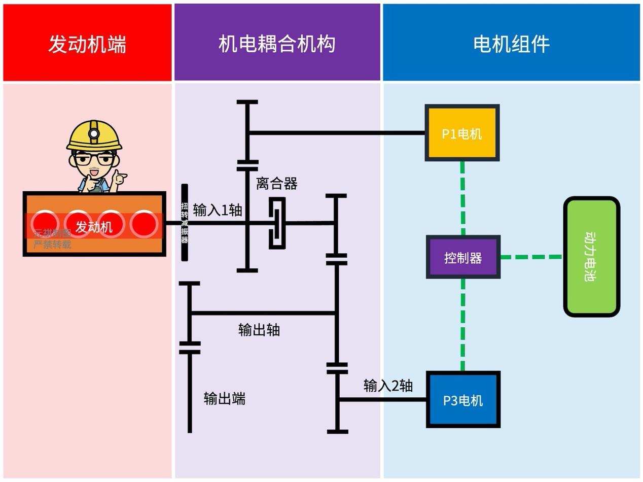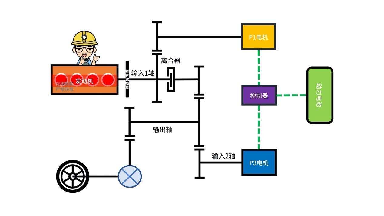 「P1电机」与「发动机」耦合,两者与「离合器」连接;