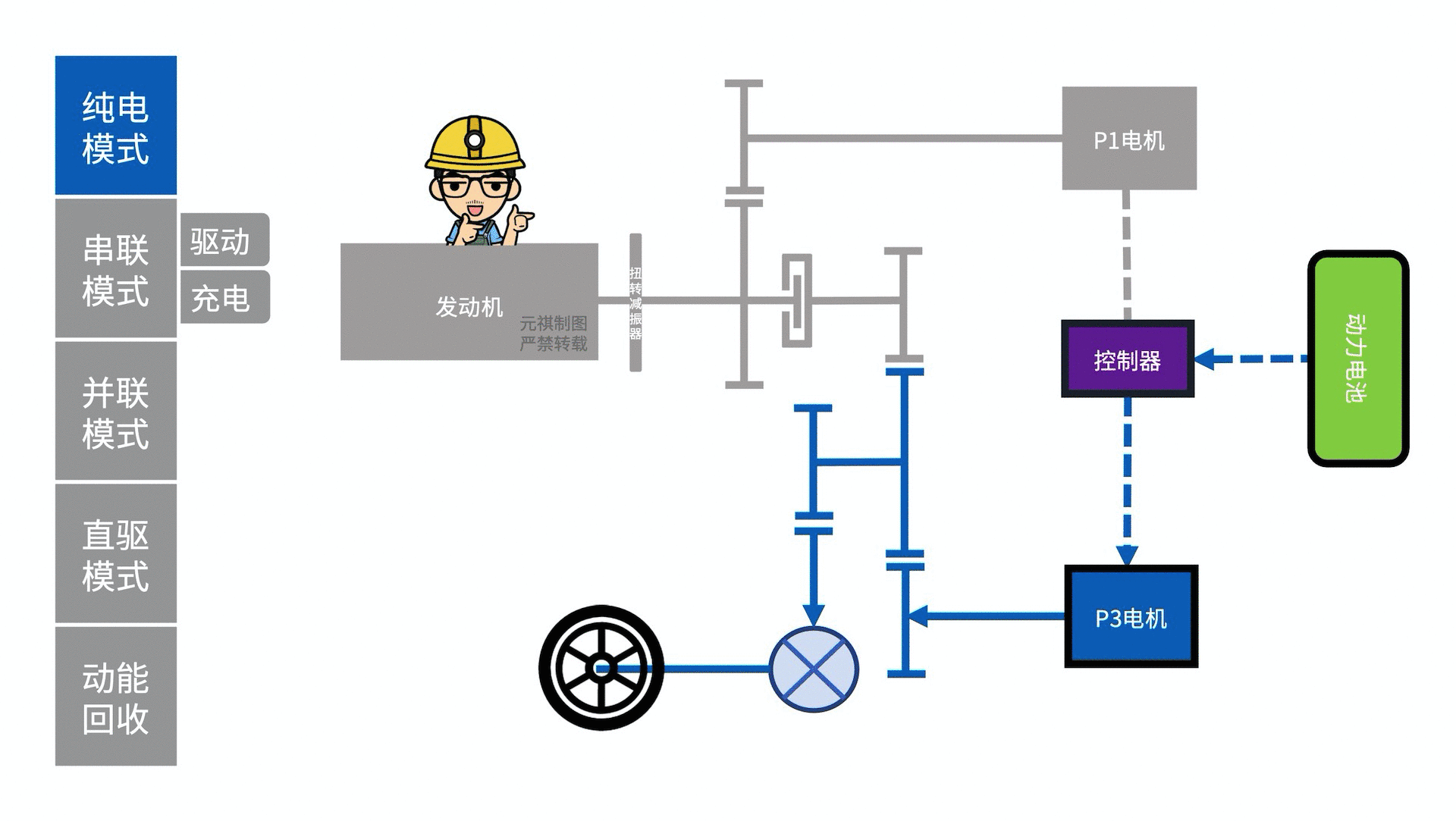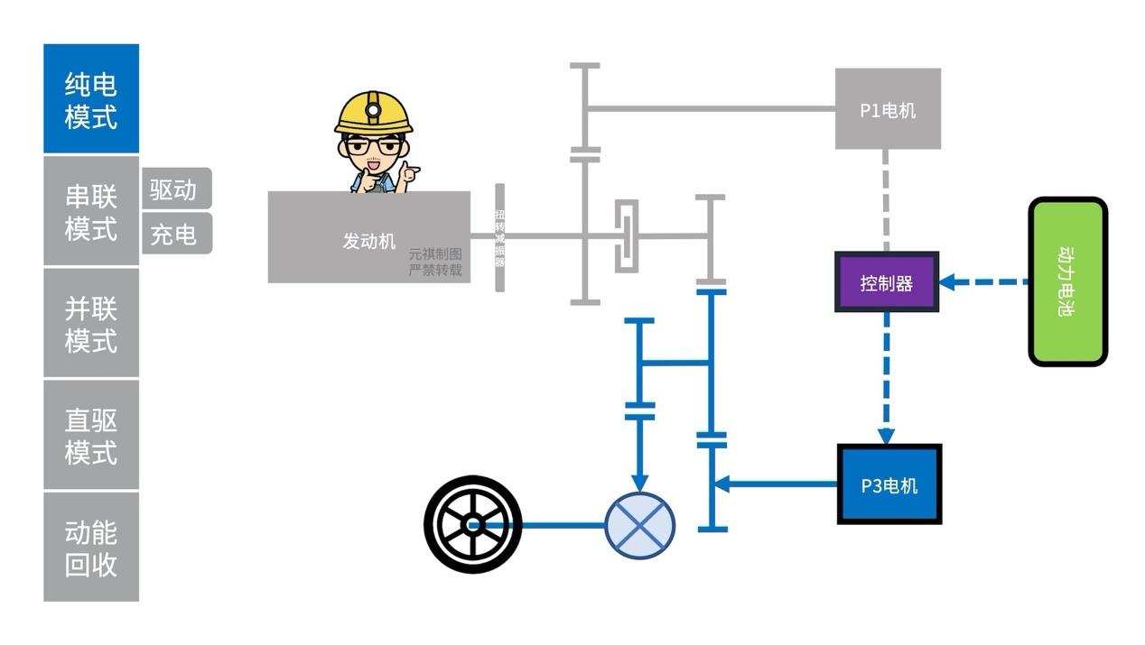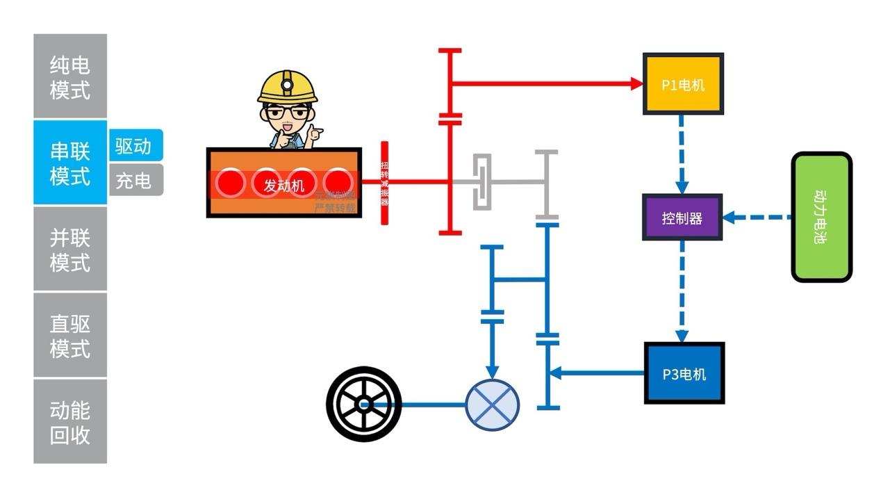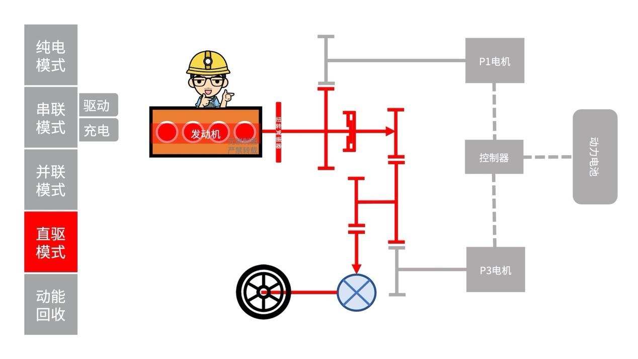 不过这并不代表整套动力总成不能变速,而变速的原理主要低速时是依靠电控来调节「P3电机」的输出功率,中高速时依靠调整「发动机」的转速,而加速时,依靠对两个动力输出源的功率进行共同调整。那么接下来就通过工作模式的讲解来具象化上面的这些变速原理。