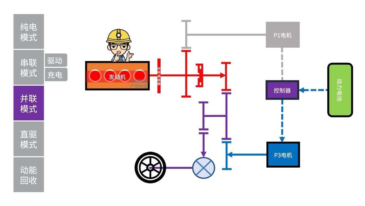 此时,前方出现了一辆速度较慢的货车,我想在高速巡航的情况下,进一步提速,所以深踩加速踏板,系统则会检测到动力需求还在提升,并可能会让「发动机」脱离最佳的工作区域,故此,系统会让「电池」给「P3电机」供电,进入全动力源输出的并联模式。