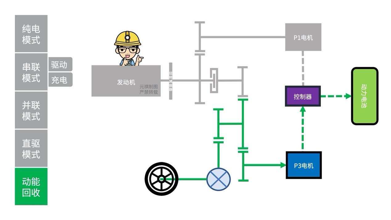 比亚迪的「E-CVT」主要提供了纯电模式、串联模式、发动机直驱模式和并联模式和能量回收这5种主要模式。那么接下来,我们仍以日常生活场景为例,比如从公司回家的场景: